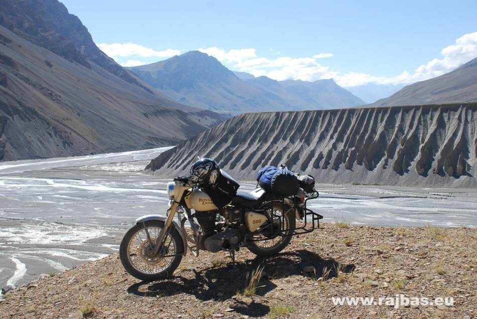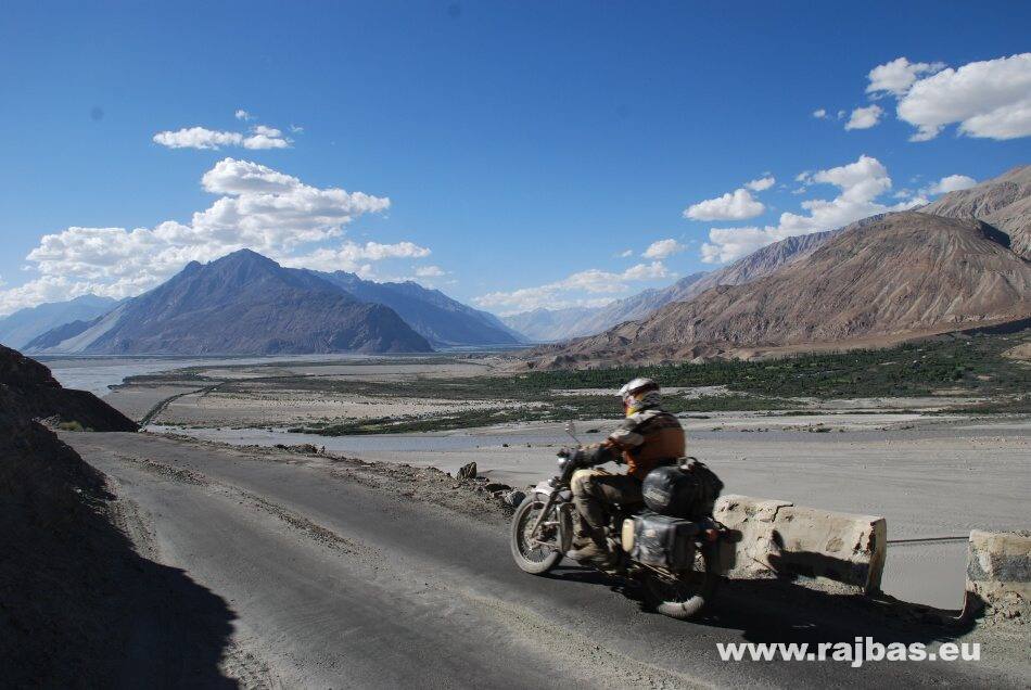 The most dramatic part starts after passing Kunzum Pass at 4450m. The deep gravel road is sometimes crossed by unexpected torrents and we thank our bikes for making it without complications through this terrain. The famous road Manali – Leh was finished in 1989 and is now the most popular way to Ladak. It is open just a few months of the year due to snow. It leads from the Kullu Valley across the highest passes of the world (up to 5328m)! The road surface varies from smooth asphalt with deep holes to a dusty dirt road with glacial streams crossing it. The road zigzags through an amazing moonscape where we meet only herdsmen, dirty workers and gloomy soldiers. The 480km-long route takes us two days with one nighttime stopover in a tent for truck drivers. We want to try some local food, so we order a chicken coumen (noodles with chicken and vegetables). The chicken is a bit suspicious and looks more like marmot, goat or dog. They reply to our question with a smile: ”It´s a big chicken, sir”! Maybe it´s better to know nothing. That night is full of alcohol tasting, mainly with Sikh truck drivers, and they are impressed by our 60% strong applejack.