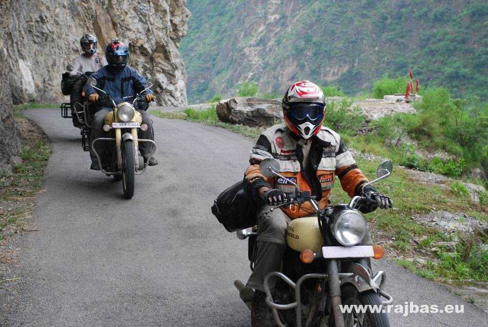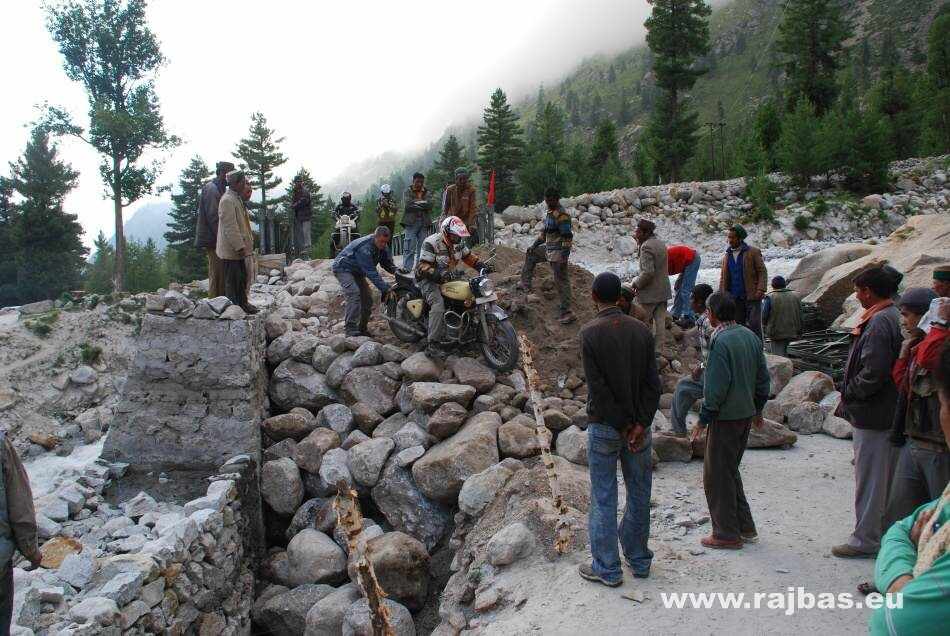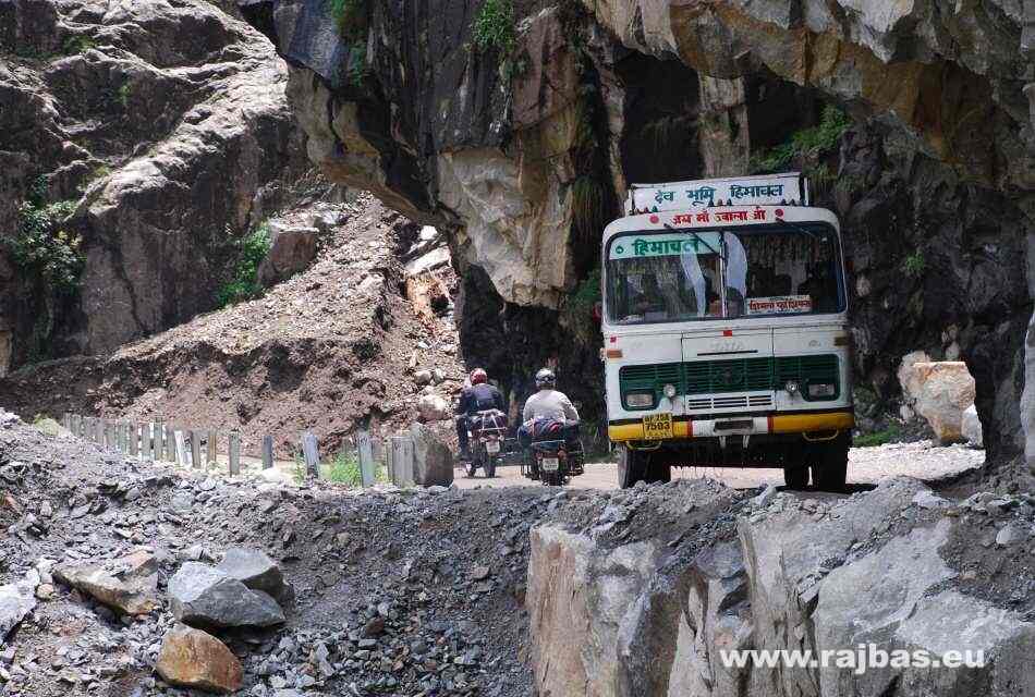 We are riding along a carved out road against steep rock slopes to the town Recon Peo where it is necessary to obtain permission to cross the border of China. It takes officers all day, so we visit Kalpa village and an ancient Buddhist monastery, or gompa, in Tibet and Ladak. We wander around the once prosperous small alleyways in the centre, and see roads cluttered up from the monsoon season that has just ended. Twice we manage to get over a cave-in, but then we wait for hours for mud and debris to be cleared. Unfortunately the last 300m-long landslide won´t be cleared for years. Luckily the Indians are masters of lash-up and they´ve built a 500m long ropeway for food and firewood transport – and our 160kg bikes. We can´t use the ropeway for safety reasons, so we walk which causes a small delay. An interesting Tabo village welcomes us in the dark.