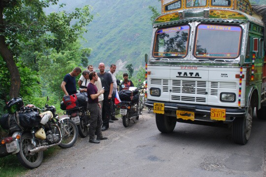 Pořád je ještě naděje, tak mažeme dál. Jedeme tak dlouho, dokud Tácek nepíchne podruhé. Anál láme všechny rekordy při výměně a lepení duše, protože v Drassu už podruhé spát nechce. A já se mu nedivím. Je totiž hinduista a takové mají v muslimském Drassu rádi jak osinu v pr….. A kdo je kdo, oni tady (nevím jak) bezpečně poznají na první pohled. Jedeme dál! Konečně jsme zpět v Drassu a přestože už je po limitu, Anál nezastavuje a valí dál. Asi deset kilometrů za městem, už ve stoupání do sedla Tácek píchl v plné rychlosti potřetí. Vpravo skála, vlevo propast. Ale o tom jsem už psal. „Tak a máme po prdeli“, myslím si v duchu, zatímco Anál jako šílený opět sundává zadní kolo. Musí být v transu, protože je v mžiku zalepeno a Anál žene beze slova dál. „Tohle přece nemůžeme stihnout“, myslím si, ale jedu, protože nic jiného nám nezbývá. Na všech check-pointech nás kupodivu pouští, tak se probíjíme dál a dál. Doslova probíjíme, protože proti nám se valí nekonečný proud nákladních aut. Silnice je sice užší a užší, ale motorka se vždycky někam vmáčkne. Někdy sice jen tak tak a když vyhýbáme na stranu, kde není skála, ale propast, tak je to zážitek nevhodný pro závraťáky. Závratí ovšem Tácek netrpí a pudem sebezáchovy zřejmě také ne, protože ho kupříkladu ani nenapadlo, aby synka v obtížných úsecích nechal popojít pěšky. Už jsme skoro v sedle, takže to asi fakt klapne. Paráda! Neklaplo to. Přesně v sedle cesta vede mezi dvěma skálami a je zde tak úzká, že náklaďák projede jen stěží a obvykle zde nechá i trochu laku z kapoty, jak je na skále vidět. Tady neprojde ani myš, takže se budeme muset vrátit. Snažit se na chvíli zastavit protijedoucí náklaďák nemá cenu, protože by jich muselo postupně zastavit několik set a každý druhý by se už v tom prudkém kopci asi nerozjel. Místní řidiči to dobře vědí. To je k vzteku! Už se nám to skoro povedlo. A navíc začíná pršet. Zatímco si oblékáme nepromoky, Anál (protože si nemá co oblékat) se baví s místními pastevci, kteří se zde odněkud vynořili se svými stády kašmírských koz. A ukázalo se, že přišli z druhé strany. A protože na téhle cestě by jim kozy zdecimovaly náklaďáky, používají stezku, která vede přes hory ještě vysoko nad tímto sedlem a kterou nám teď ukazuje. „Anále, to snad nemyslíš vážně? Touhle kozí stezkou teda na motorce rozhodně nepojedu! A navíc pršíi!!“ „A Tácku, neblbni a nejezdi tam!!!“ „ Okamžitě se oba vraťte!!!!“ Jak si asi myslíte, že to dopadlo? My jsme ty hory fakt přejeli po kozí pěšině. Podrobnosti vám popisovat nebudu, protože i po letech dostanu kopřivku když si na to jen vzpomenu. Nicméně sotva se nám podařilo dojet do nejvyššího bodu (a že to bylo opravdu vysoko jsme poznali podle toho, že auta v sedle pod námi byla jako krabičky od sirek), přestalo pršet, vysvitlo slunce a my uviděli hluboko pod sebou na druhé straně hor Sonamarg, který už byl na dosah ruky a kde už budeme mít to nejhorší za sebou.