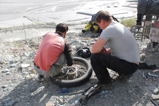 Žádný zázrak se nestal, takže mě Ode budí fakt ještě za tmy (s tímhle Odem se vyspím asi až v hrobě). Teď už sedím v Kargilu s Táckem a synem a pijeme čaj. Oba jsou viditelně rádi, že mě vidí a já se jim vůbec nedivím. Anál už spravil řetěz i brzdu a teď někde svařuje ten rám. Vypadá to, že všechno klapne, protože rám už je spravený a můžeme vyrazit. A klape to. Tedy jen do chvíle, než Tácek poprvé píchne. Anál spravuje a čas běží.