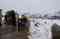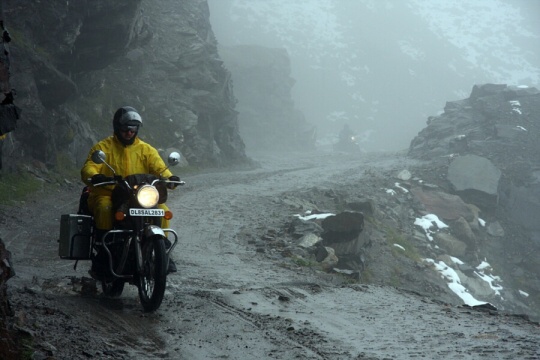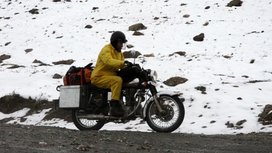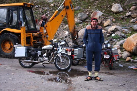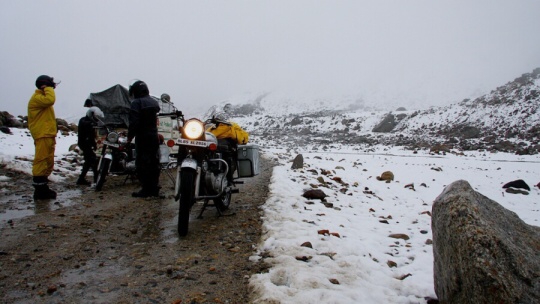Takže maximálně za dva a v hlubších kalužích za jedna. Jde to pomalu. A je to čím dál horší a vody přibývá. Výfuky jsou v jednom kuse pod vodou, tak hlavně aby nechcípl motor. A už se stalo. Zkoušíme (teda hlavně náš indický mechanik) měnit svíčku a když to nepomáhá, tak musí dolů nádrž a mění se cívka. To všechno za deště, takže chudák kluk je durch a třepe se zimou. Není divu. Všude kolem leží sníh.