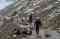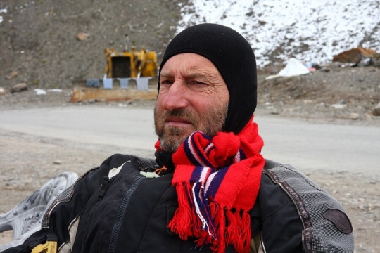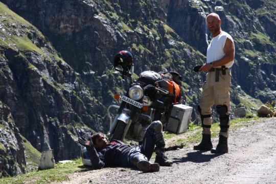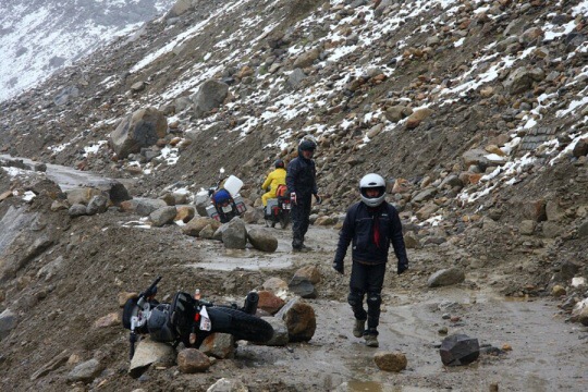 Tady jsme narazili na partu anglánů (jedna holka a čtyři kluci), kteří zrovna dorazili z hor a všichni, až na slečnu, mají sněžnou slepotu. Kde k ní v tomhle počasí přišli, vědí bozi. Nicméně jeden z nich je úplně slepý a ostatní mají místo očí jen zhnisané škvírky. Dali jsme čaj, popřáli jim good luck a chystáme se dále. Buďte opatrni, říkají nám místní. Včera tam, kam jedete, zabil padající kámen jednoho motorkáře. Máte helmy? Jo, helmu mám, ale taky vím, že kameny padají nejvíce za deště, který zrovna zesílil.