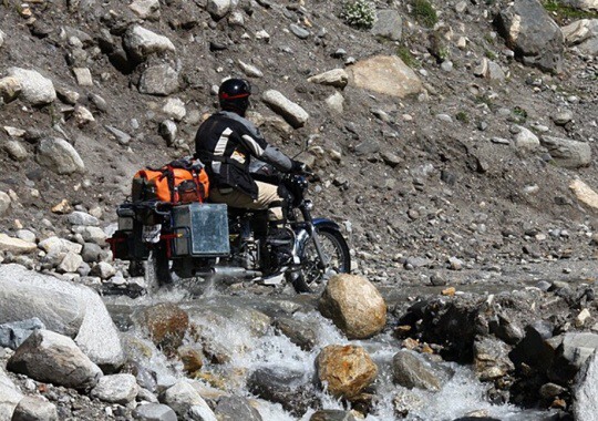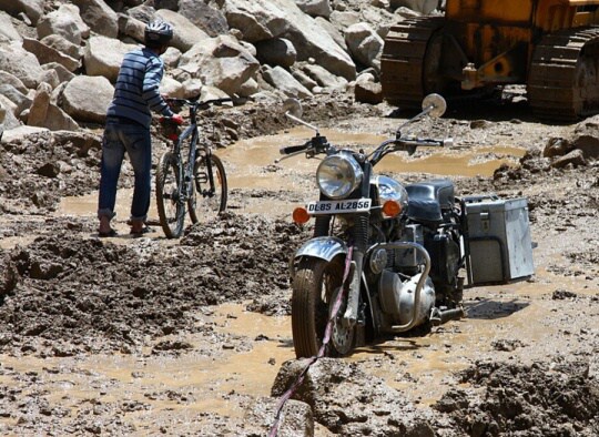 Ale motorka naskočila a jedeme dál. Čeká nás pěkně vypečený úsek. 100m potokem asi tak po kolena plném velkých balvanů. A když z toho první motorka vyjela, tak zapadla do řídkého bahna, které sjelo na cestu asi před chvílí, až po osy. Já jsem jel druhý, takže jsem zastavil zavčas a než jsem slezl z motorky, spadlo mi před přední kolo několik balvanů, před kterými by mě helma rozhodně nezachránila. Až teď jsem si všiml v bahně ležící cizí motorky placaté jak amoleta. Tak tady skončil ten včerejší motorkář! A kameny padají stále. Přetlačujeme naše Enfieldy přes to bahnisko jednoho po druhém jako šílení, ať jsme co nejrychleji co nejdál.