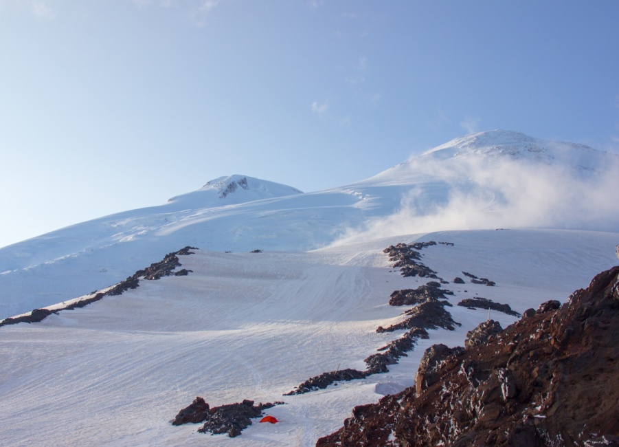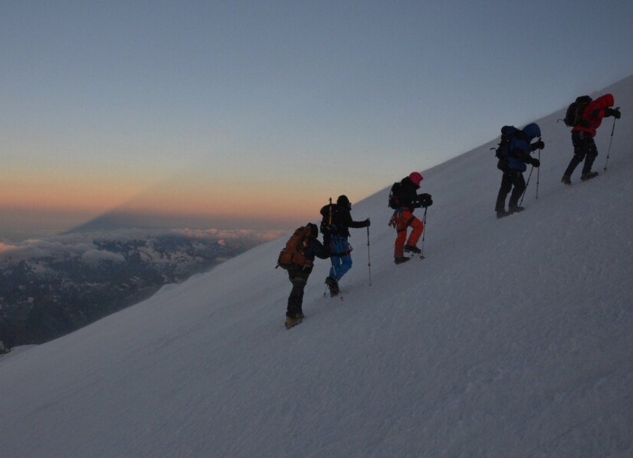 2. den výstupu – vyrazit brzy ráno kolem 4 hod . Výstup po Pastuchovy kameny 4800 m je přímý, následuje traverz do sedla 5300 m mezi vrcholy Elbrusu. Ze sedla můžete zvolit výstup na snazší, bližší Východní vrchol 5 620m a nebo na náročnější strmější Západní vrchol 5642 m. Nejzdatnější turisté zvládnou oba vrcholy najednou. To uskuteční ale jen 20% z těch, kteří to plánují. Výstup na vrchol trvá asi 6 hod a sestup na Prijut 11 asi 3 - 4 hod. Většinou se stihne ještě po odpočinku sestoupit k lanovce a sjet dolů.