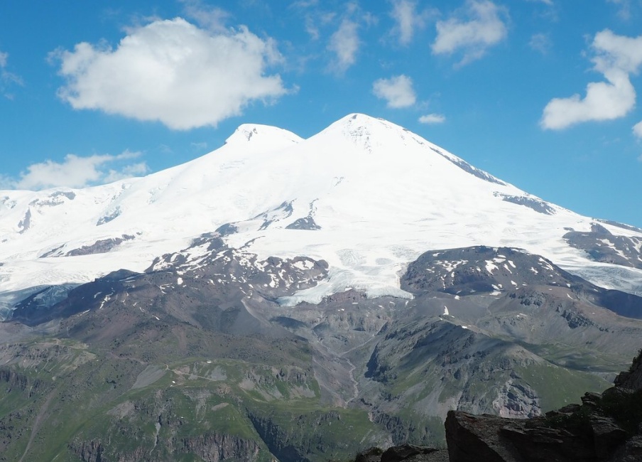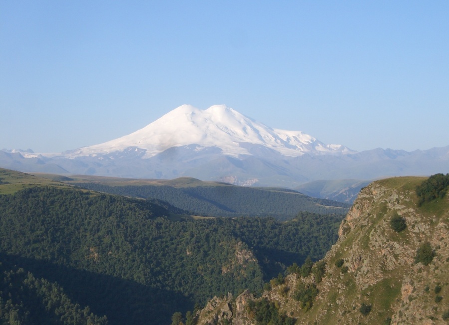 Elbrus - neaktivní vulkán s z dálky viditelnými západním 5 642 m a východním 5621 m vrcholy, je nejvyšší horou Kavkazu, Ruska a podle některých názorů i Evropy. Hledisek politických a geografických je celá řada. Každopádně je Elbrus nejvyšší horou od Afgánistánu na západ. Dle řecké mytologie byl k Elbrusu přikován Prométheus Diem, kterého později osvobodil Héraklés.