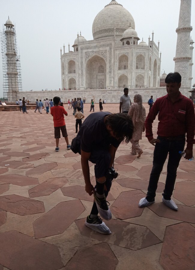 Jak si Indové stavby, prostoru Tádž Mahálu váží a chtějí, aby byla co nejlépe dochována, svědčí i to, že při vstupu si nazouváte na boty návleky a v těch pokračujete dál.