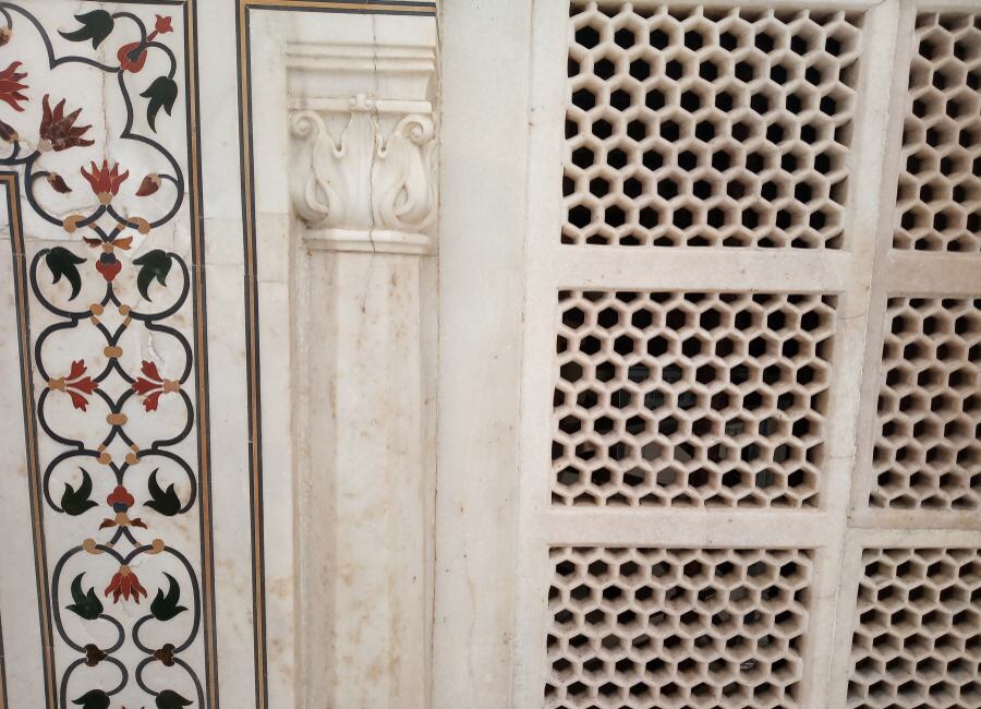 Je vystavěn na obří podestě s pilotami, aby řeka nemohla způsobit pohyb podesty. Červený pískovec a cihly - základní stavební materiál, je obložen bílým mramorem s nádhernými s vyřezávanými a vkládanými florálními ornamenty z drahokamů a polodrahokamů, technikou Pietra dura. Kaligrafická výzdoba je provedena černým mramorem.