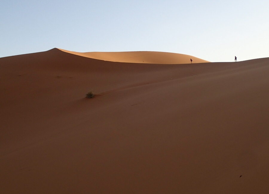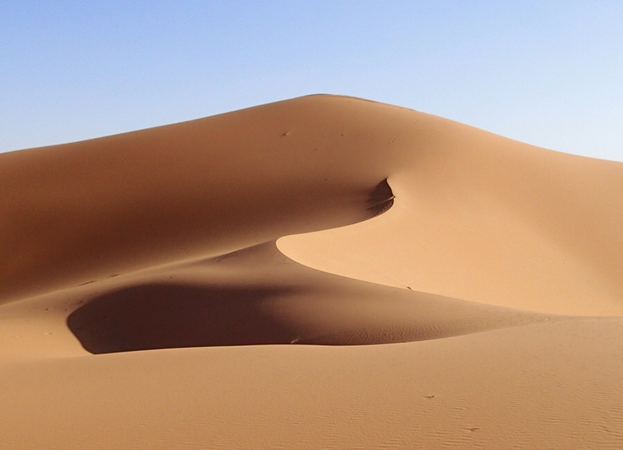 Afrika, největší poušť světa Sahara, jeden z jejich výběžků do Maroka na hranici s Alžírem - největší a nejznámější duna, to je Erg Chebbi. Přesahuje své okolí o 150 m. Písečné duny a slunce na ně dopadající, připravují dnes a denně, znovu, úžasnou podívanou, měnící se v každé chvíli s časem, pohybem slunce od obzoru k obzoru. Měkké raní světlo přechází v ostré polední, aby se západem slunce se opět všeho dotklo, vykouzlilo z tvarů tvary krásnější, i s jejich stíny, barvám dodalo sytost a ve zlaté hodince vytvořilo nezapomenutelnou atmosféru. Člověk nestačí fotit nebo všechno pustí, úplně se oddá přítomnému okamžiku a vnímá jen jej a prostor kolem sebe. Nejkrásnější jsou zlatá, růžová, oranžová - barvy ranní a večerní, zatímco přes den se zdá bít písek téměř bílý.