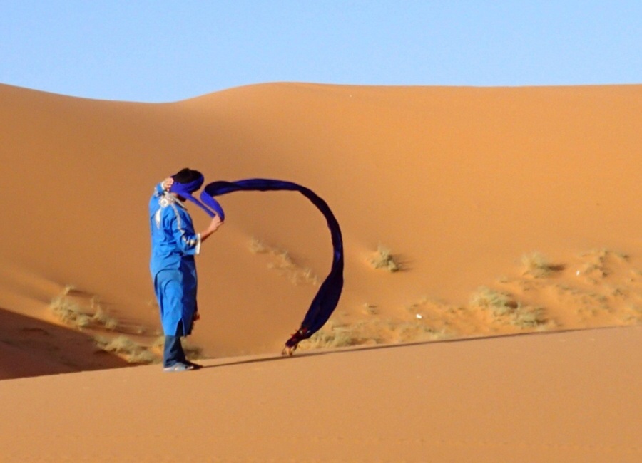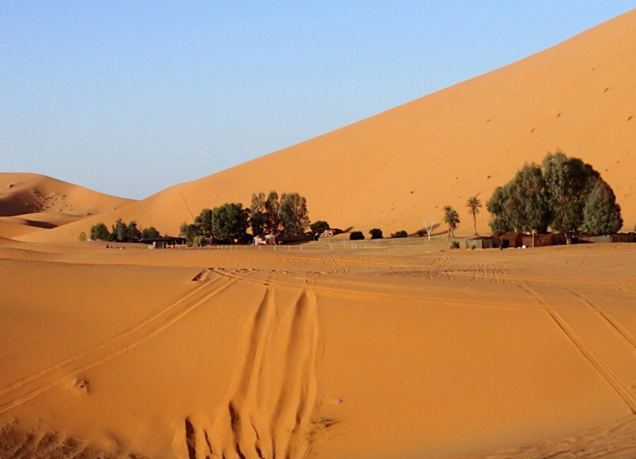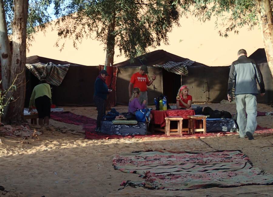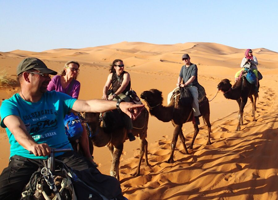 Turisti mají štěstí, protože Maročani jsou turismu a výdělku z něho velmi vstřícní. Můžete tedy do pouště vyjet s karavanou na velbloudu. Po dvou hodinách dorazíte do oázy, kde vyšplháte na hřeben duny, projdete se po něm, budete pozorovat stopy své, těch před vámi, jak vítr jemně pozvolna jejich tvar mění. Uvidíte nekonečné písečné moře dalších dun kolem. Pak se slunce začne přibližovat horizontu a všichni chtějí být u toho, když zapadne. Po tomto magickém momentu nastává čas seběhnout nebo sklouznout se po písku dolů, do oázy s několika zelenými stromy. V plátěných beduínských stanech je zde připraveno na zemi spaní a ve společném prostoru uprostřed skvělá večeře. Trocha beduínského bubnování a už je tma, kdy je zase čas pozorovat. Tentokrát noční hvězdnou oblohu. S ránem a snídaní nezbývá, než se oázou rozloučit, sednout opět na velblouda a putovat zpět. Váš průvodce od velbloudů na chvíli odběhne, ať si můžete vyfotit modrou vlnu jeho turbanu než se stanem turbanem. Výlet do pouště je nezapomenutelný zážitek.