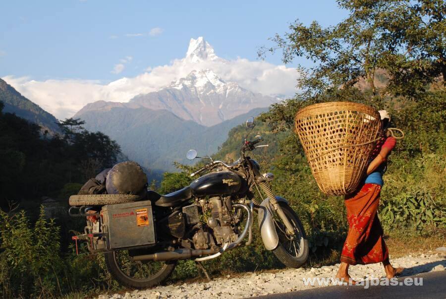 The trackers recovering here after their long trips take advantage of western cuisines. Here, the connection to the outer world is easy thanks to many internet cafes and public phone centres. Watching the astonishing panorama of the Himalaya range in the north, beautifuly illuminated by the rising sun, became a ceremony for every tourist. nepal_enfield_35-nahled We do the same and get up early so as not to miss the amazing performance. We take impressive pictures of our bikes with the peaks of Annapurnas, Dhaulagiri and Makcapuche in the background. Unfortunately our return is complicated by an accident. Petr has a problem with pulled knee ligaments in spite of having worn a knee brace.