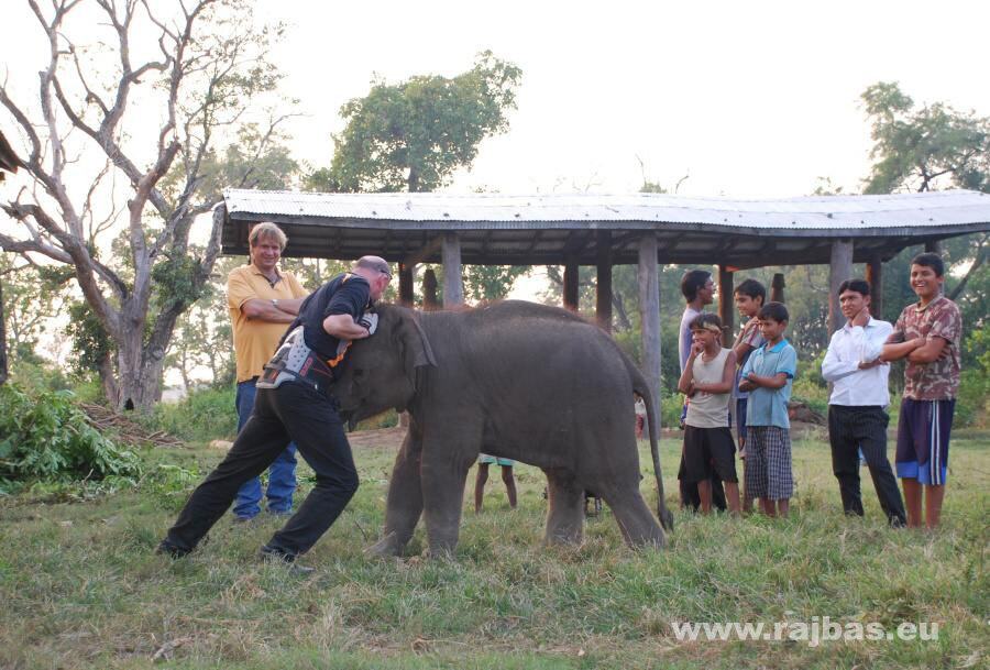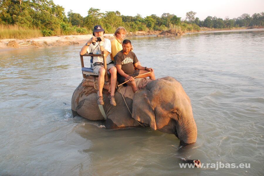 We can´t miss the opportunity to experience the wilderness from the back of an elephant and possibly meet other elephants or even tigers! This is a very commercial idea but we decide we can support the national park and its inhabitants. We pay 1000 rupees an hour for 1 elephant + the 500 rupee entrance fee into the park. We arrange this trip for Friday as the schedule for tomorrow is full. We want to experience one day in the wilderness on raft in one of the branches of Karnali river. We ride 45km up to an impressive bridge behind which is the start of our water adventure. Our guides aren´t very familiar with the raft, and luckily the water is not wild. After some time we enter the branches of the river where elephants, tigers and rhinos come to drink. But we lack some good luck as there are no animals in sight. We see footprints everywhere but no crocodiles or gavians, only palmipeds. Our rafting ends at an elephant farm with cub elephants. One of them, a five month-old baby of 200kg jogs our 50kg Marcela – the only woman of our crew – and she flies off 2m into the nearby branches! It might have been just from joy of life or worries about its food. Next morning we sit on the back of an elephant making it throught the trees along the river. The next morning dew is everywhere, haze is rising from the undergrowth and my attention is being drawn by the other elephant guide who sees a rhino standing in the river, sniffing and then running away into a thick bush. We continue and soon we meet a rhino couple. Suddenly yet another big boy appears 20m away from us. We can see that both the elephant guide and the elephant are frightened by this surprising encounter. The huge animal turns back and runs away into the jungle with heavy stomping. The rest of our journey passes quietly with no more extreme experiences.