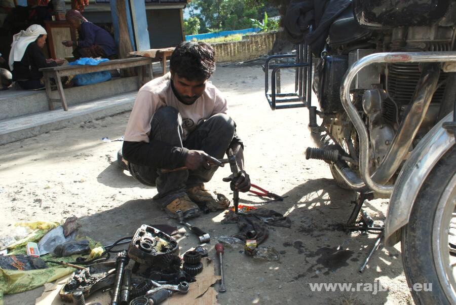 Yesterday Peter met a professional photographer who told him about an excellent route for motorbikes – difficult but with great views. nepal_enfield_03-nahled Our goal is Jumla, 240km off the asphalt road to the foothills of Himalaya. From there it´s a two-day-walk to Rara national park. Black himalaya bear, goat antelope and the rare red panda live there. With courage we head toward our new goal. The drive is more difficult and much slower than we expected. After 4 hours, we have traveled some 30km on a dusty trail full of stones and pot-holes. I can feel my engine losing power and last few kilometers are torture. At a bridge at Dugeswar village, Anel looks at the engine using a headlight and diagnoses the problem. There is a valve seat cracked and it cannot be ridden. In the morning I shamefully load my motorcycle onto a random tractor passing by and return to Sukhet. Anel and the rest of the crew carry the engine head as they ride their Enfields ahead. He assures me that it will be fixed I have no clue how. As we enter Sukhet in the late afternoon, I find that my bike is ready to ride! A local mivvy was able to make a new valve seat on a prehistoric lathe, shape it with a cutter, and Anel refaced it. We´ll never understand how he calculated the exact overlap using only a snap gauge! The only thing that matters now is that my motorbike is running. We run out of time and decide not to go to Jumla. nepal_enfield_17-nahled Now we head for Lumbini – the birthplace of Buddha and thus the most sacred place for all Buddhists. It means we must cross 340km through the fertile lowlands up to the Indian boarder. We make it almost in one day, dashing through picturesque villages with rice harvest on the way, fields of oilcake in blossom, banana-trees at every house and kids playing happily. People here are poor and live quietly.