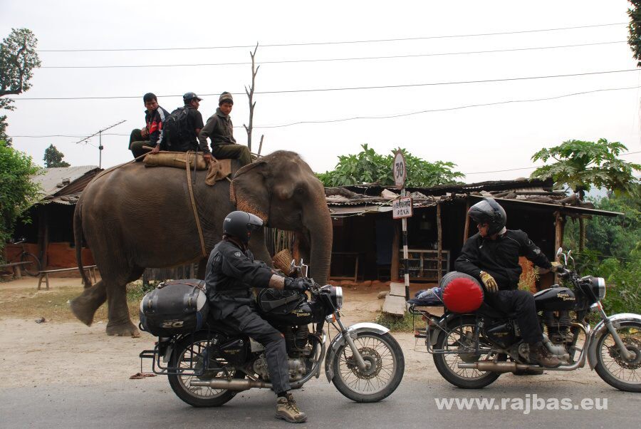 On the Indian side there no cameras are allowed. However, the Nepalese have no problem with it. They willingly offer to exchange our dollars. After disappearing for half an hour they come back with the sum, probably collected from all of their neighbours. They were not able to exchange everything but we are thankful for their help. There is no sign of an exchange office anywhere. nepal_enfield_06-nahled Our first destination in Nepal is the nature preserve called Sukla Phanta. We make our first rudimentary mistake. We follow the advice of the first person we ask for directions without verifying it with at least two more natives. Ask a Nepalese: ″Excuse me, does this road go to…?″ In order not to disappoint you, he will answer ″YES″ every time even if he doesn´t understand a word. For this reason we do not find the entrance to the preserve tonight. But we learn that we should definitely not ride in the night next time. Pedestrians, cows, sheep, buffalo, motorcyclists and cyclists on the unlit roads are too big of a risk.