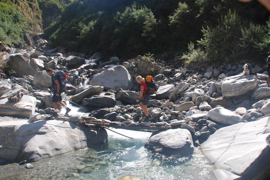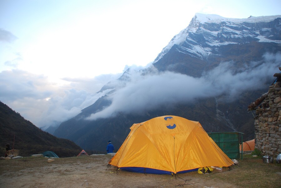 9. den: Stále proti proudu Myagdi Khola až do Italského BC 3 660 m s úžasným výhledem na jižní stěnu Dhaulágiri, pět hodin pochodu.