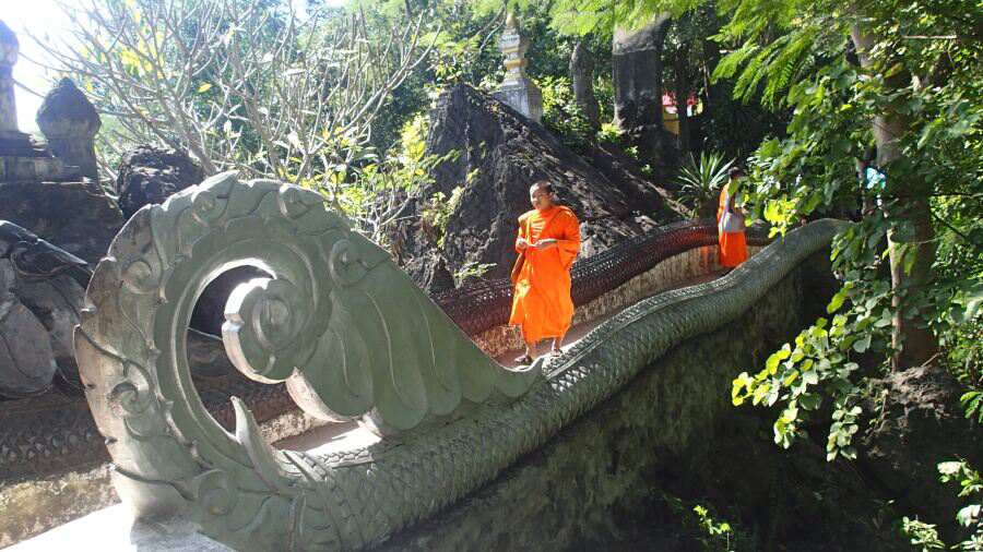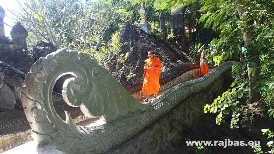 7. – 8. den: Den volna v Louang Phabang (vznešenost plná francouzského šarmu) - klášter Wat Xieng Thong UNESCO, noční market, tradiční masáže, výlet lodí do whisky village, jizda na slonech a návštěva jeskyně Pak Ou. Na motocyklech do Vieng Kham s výhledy na hornatou krajinu. Alternativa část trasy offroad pěšinou proti proudu řeky Nam Xeng 190 km, 50 offroad.