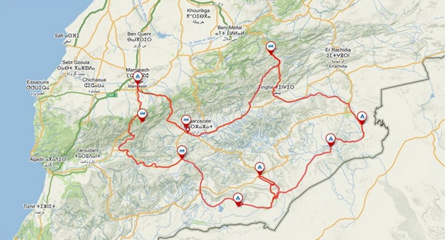 13. den: Telouet – Marrakech - zpět přes Vysoký Atlas, občas i zasněženým sedlem Tizi n´Tichka (2260 m), sjezd do Tadarettu, Ait Ourir, Marrakech. Vrácení motorek.(120 km).