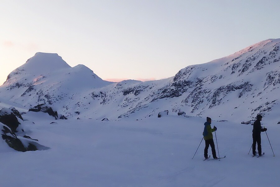 3. den: První polovina dnešní trasy bude pro změnu do kopce a potom stále po rovině. Stoupání nebude strmé, ale kdo špatně namaže, bude mít nefunkční šupiny nebo skin na skluznici, pěkně se nadře. Nocleh v samoobslužné chatě po špičatým Mjølkedalstinden (2138 m). Komu bude ujetá vzdálenost málo, tak po nanošení vody a dříví může vyrazit na okolní svahy. ↑ 500 m, ↓ 0 m, ↔ 15 km