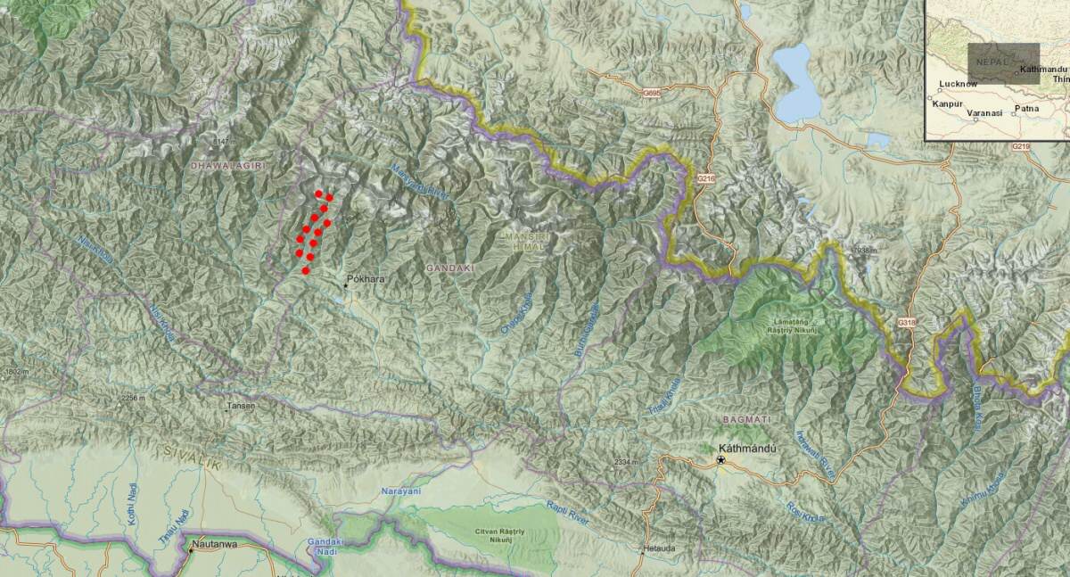 8. den: Sestup hustými lesy, mineme několik vesnic s cílem Jhinu Danda 1 780 m s horkými prameny v kterých dáme odpočinout unaveným svalům po dlouhém dnu. ↑ 760 m, ↓ 2 400 m, ↔ 15 km