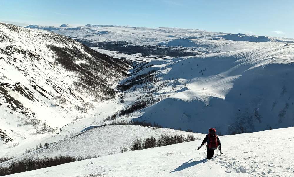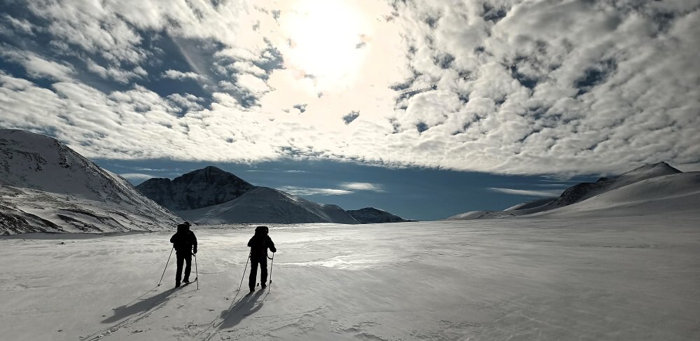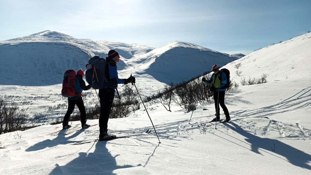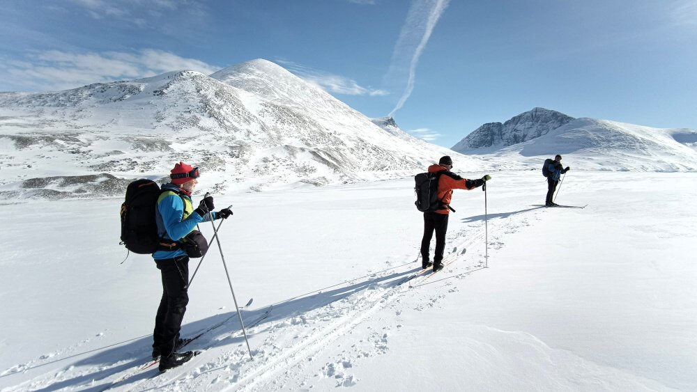 4. den: Dnes scénicky královská etapa pod nejvyššími vrcholy NP Rondane – pozvolný výjezd do místy ledovatého sedla v 1 267 m, méně pozvolný sjezd na jezero a po jeho zamrzlé hladině 4 km na hotel se zaslouženou horkou sprchou, polopenzí a pivem. ↑ 300 m, ↓ 200 m, ↔ 15 km