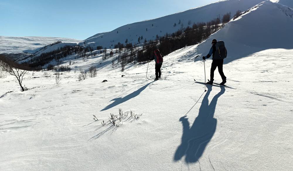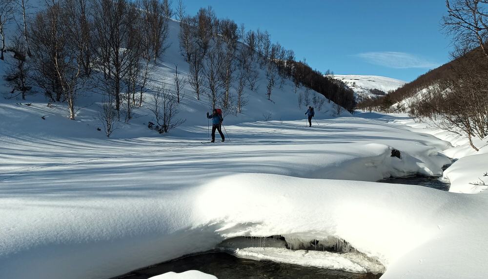 2. den: Taxi do hor, překonání horského hřbetu, jehož závěrečný sjezd je tak strmý, že sundáme lyže a půjdeme raději pěšky. Běžky nazujeme v údolí a podél říčky na chatu. ↑ 500, ↓ 400, ↔ 16 km