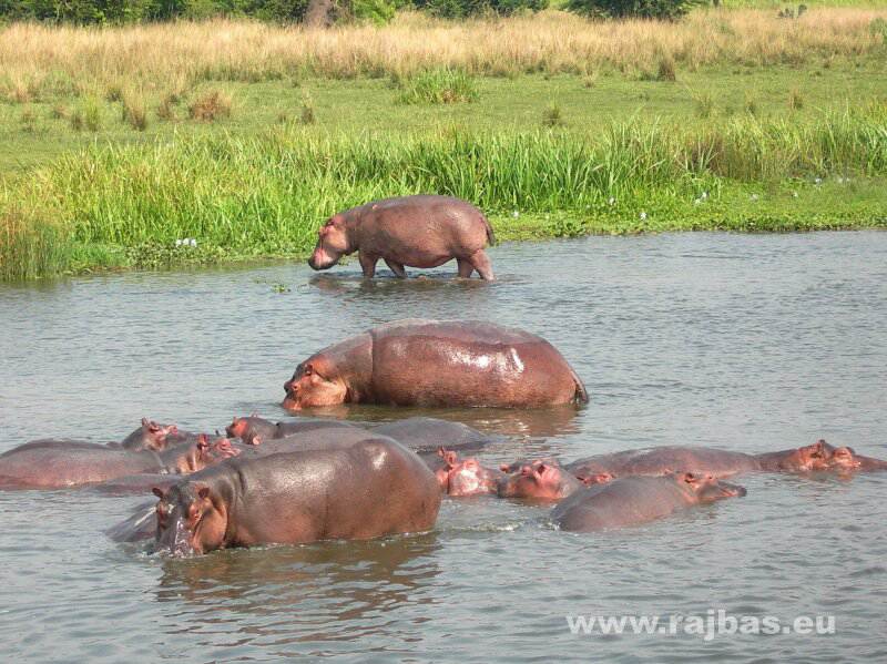 7. - 8. den: Queen Elizabeth NP –zastávka u Katwe Lake (kráterové slané jezírko), které bývalo hlavním zdrojem soli v Ugandě (šance vidět plameňáky); safari s šancí na další savanová zvířata, plavba po kanálu Kazinga mezi jezery George a Edward (údajně největší koncentrace hrochů v Africe a spousta druhů vodních ptáků, krokodýli, snad i sloni, buvoli, atd.). Ubytování na poloostrově Mweya, který je sám plný zvířat.